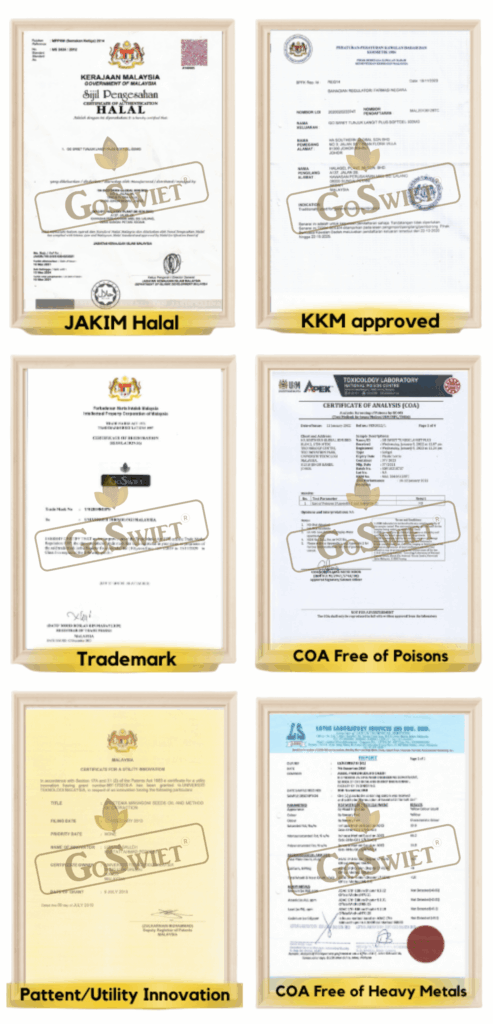 Sifat bahan dalam GoSwiet sendiri adalah natural dan bukan bahan kimia berbahaya disamping pelbagai ujian makmal telah dilakukan. Dan fungsi produk ini adalah supplemen dan bukan ubat.
